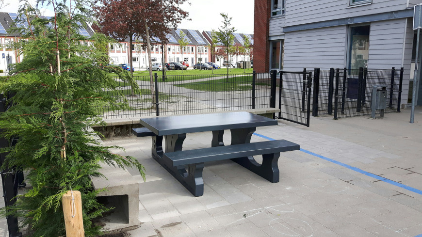 Mais oui, ceci est vraiment une table en béton ! Ce modèle a une finition en anthracite mat. Cette table invite vraiment à s'asseoir. Idéale le long de pistes cyclables, sur des places et parcs publics. Pour vous reposer, vous détendre, manger quelque chose ou pour boire un verre.