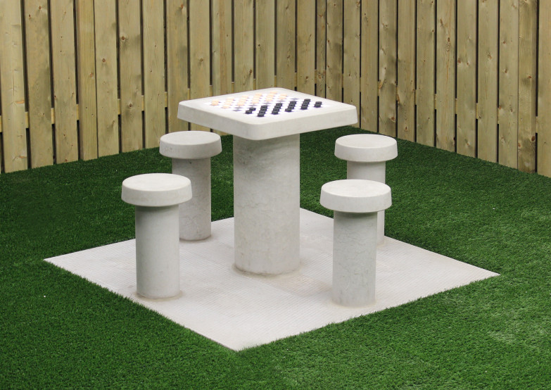 Cet ensemble en béton naturel consiste d’une table de jeu de dames sur sa plaque de fond et de quatre sièges. Les 100 cases (50 en blanc et 50 en noir) sont de marbre et de pierre bleue, intégré dans le béton.